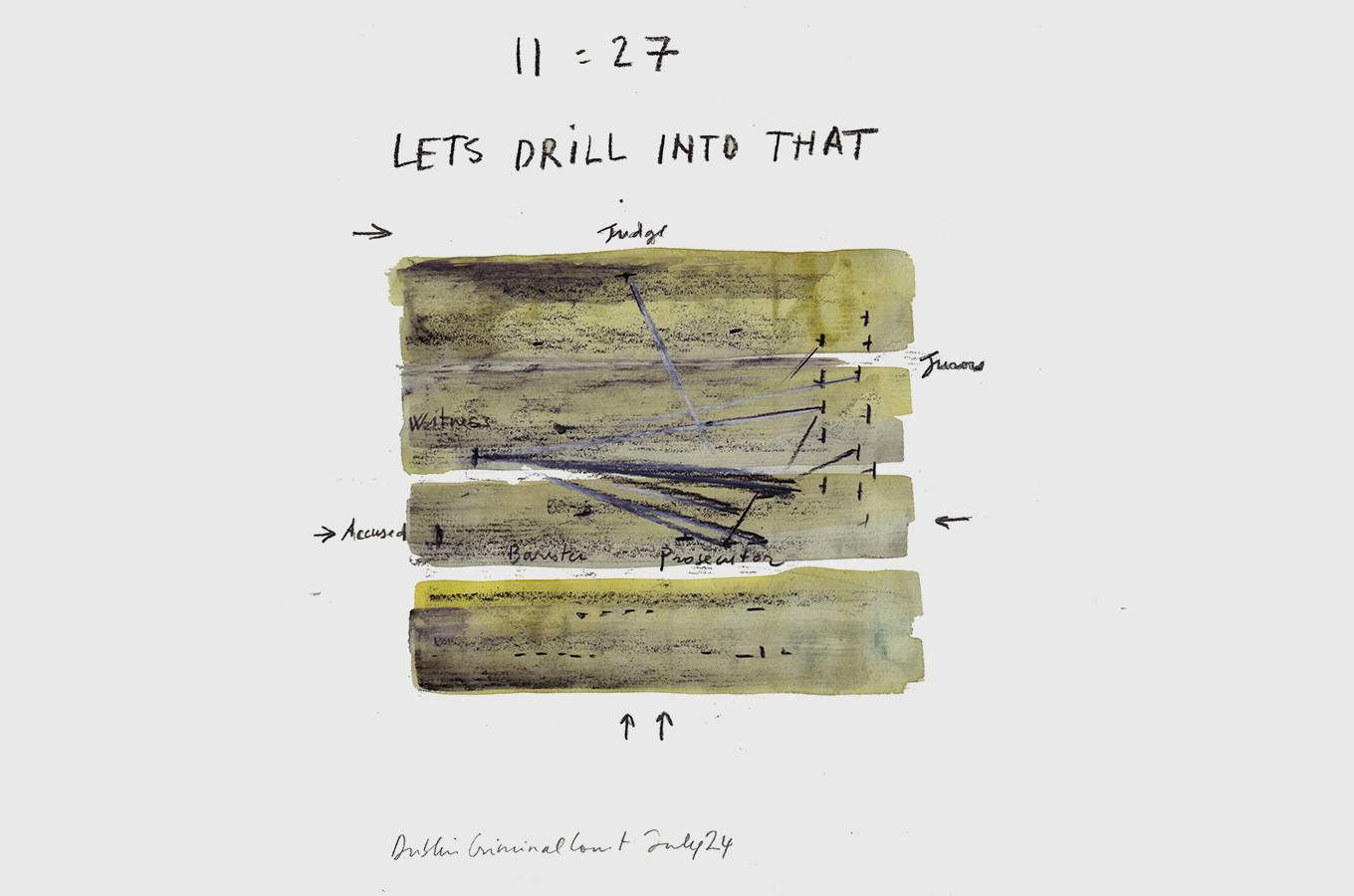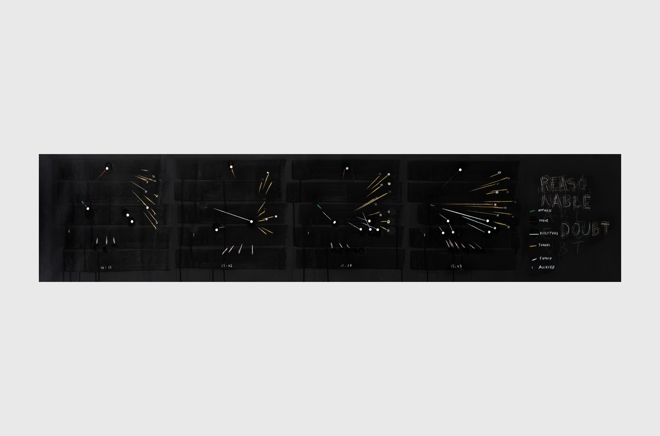 The trial is a serie of 12 paintings : waiting, cross-examination, silence, closing argument, truth, verdict, without reference to any specific criminal case. Installed in the courthouse waiting hall, "the salle des pas perdus“, the work invite all visitors to move through the space and shift their perspective. From 2027, the exhibition will be presented in the courthouses of Paris, Strasbourg, Bordeaux, Saint-Nazaire, Toulouse, Alençon, Coutances, Argentan, Lisieux (…). A text by Denis Salas presents the exhibition.